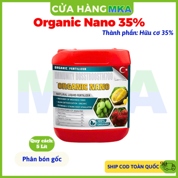Can oganic nano 5 lít MKA nhập khẩu Tây Ban Nha cung cấp 40% amino acid giúp phát triển bộ rễ, cải tạo đất và phục hồi độ phì nhiêu đất; Giữ nước và dinh dưỡng, giúp cây trồng hấp thu phân bón hiệu quả. Áp dụng nhiều giai đoạn: Nuôi cơi, nuôi hoa và nuôi trái. Tăng cường sức đề kháng của cây trồng. Phục hồi cây suy yếu, sau thu hoạch.